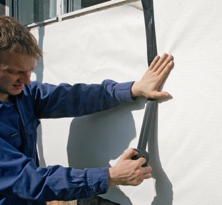 Isoleringsmåtterne (D) skubbes nemt på plads, når skelettet er lukket af omkring døre og vinduer. Spildet bliver minimalt, fordi afstanden mellem de vandrette lægter (B) passer, så de holder sig selv. Husk handsker og støvmaske.