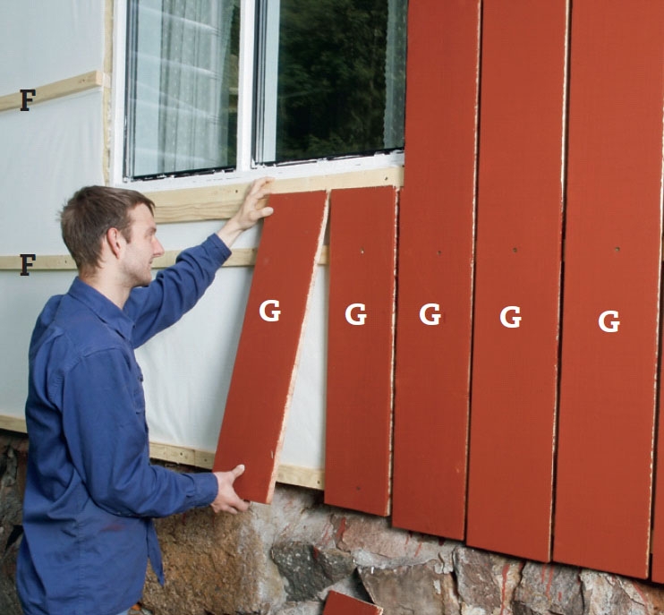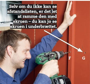 De malede underbrædder (G) skrues på afstandslisterne (F). Hold dem op til mærkerne, og gør dem fast med en enkelt skrue i hver liste. Brædderne er skåret præcist til i toppen, så de følger vinduer eller tag, men de er lidt for lange.