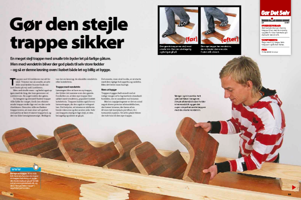 Trappen bygges helt enkelt ved at vælge vanger af to lag høvlede standardbrædder, der er smallere end trinene. Med en kap/geringssav er det en smal sag at skære præcise afstandsklodser, der bærer trinene, der laves af en 40 mm tyk bordplade på tilbud, fx i træsorten nyatoh. Ud af én plade bliver der tolv trin til den nye trappe.