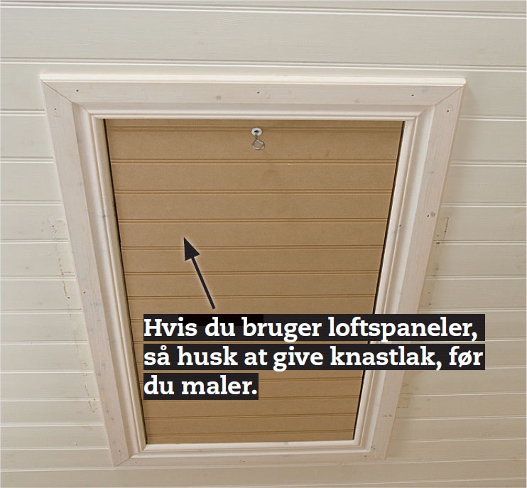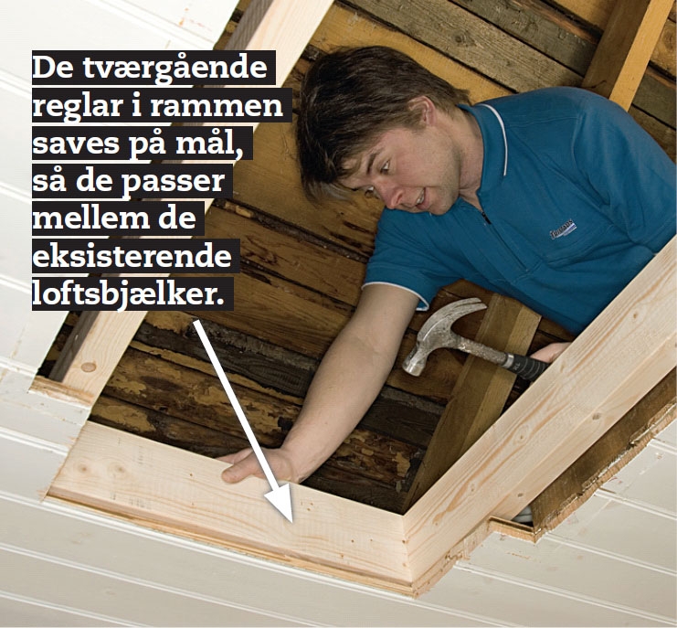 Mål loftslemmen og afstanden mellem bjælkerne på loftet. Sav de reglar til, der skal sidde rundt om lem men. Hvis loftet er fyldt med løs isolering, må du bygge en “kasse” af fx krydsfiner, så isoleringsmaterialet ikke drysser ned.