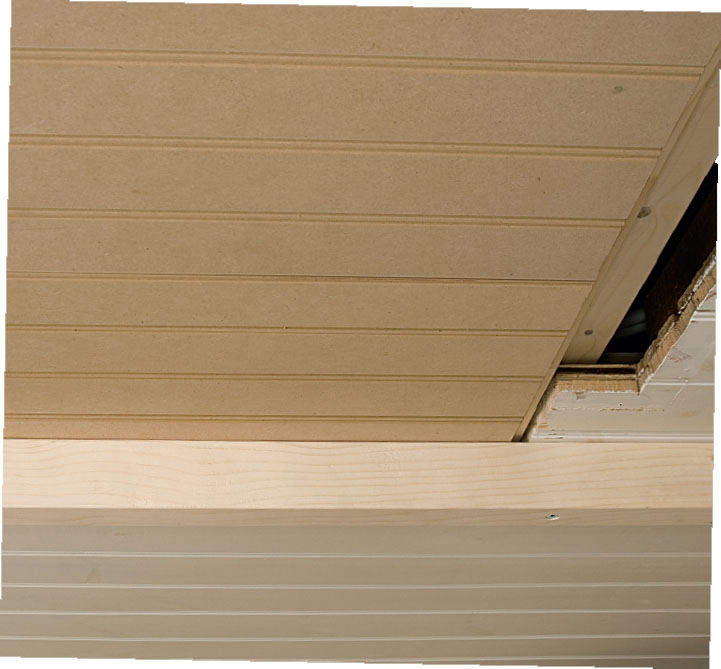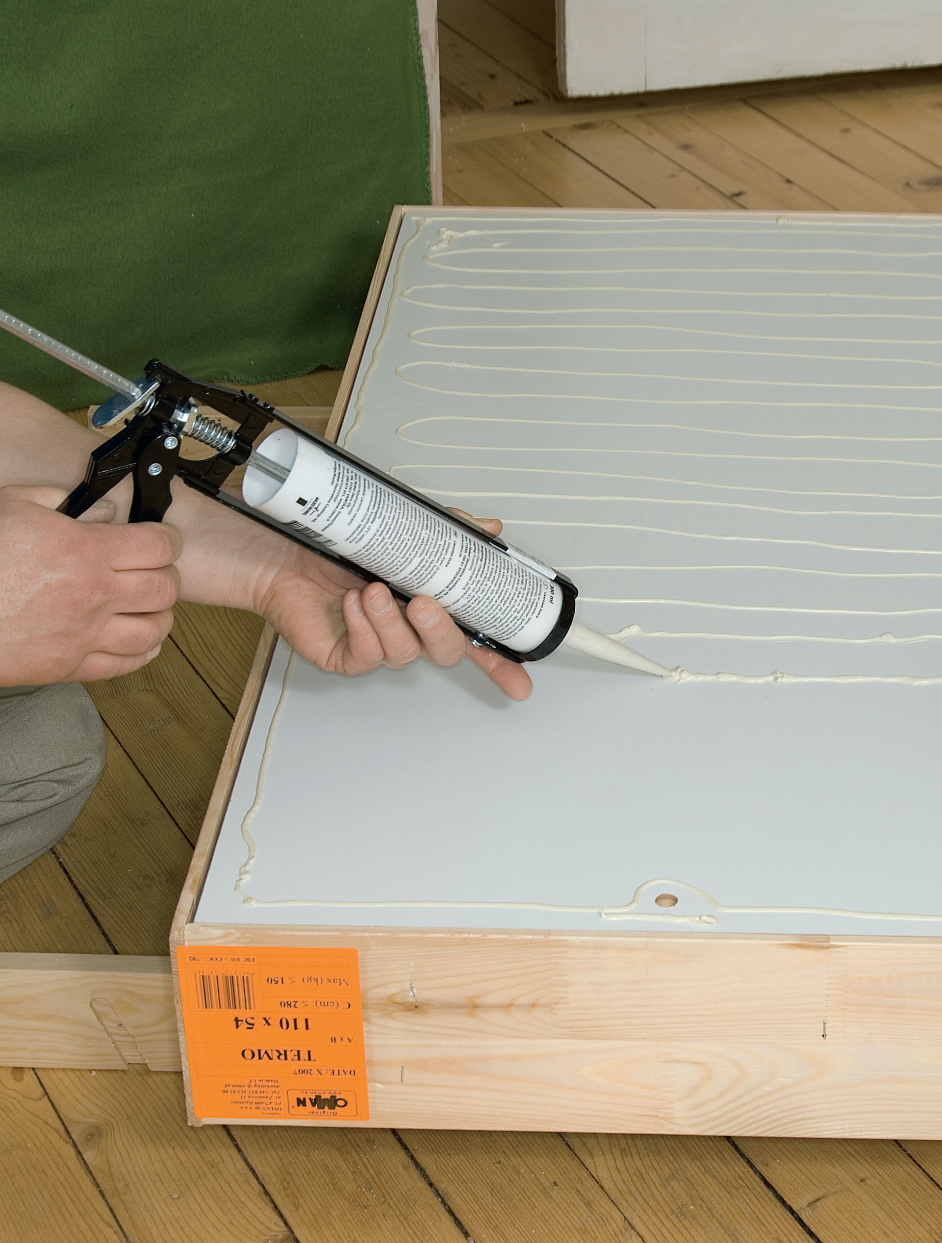Loftslemmen leveres med en gipsplade beklædt med laminat. Lemmen skal beklædes med loftspaneler. Det er en tynd mdf-plade med udfræsede spor. Vi begynder med at trække lim ud i passende lange baner.