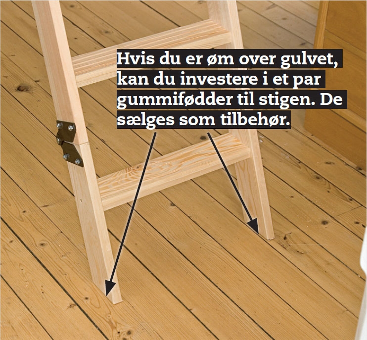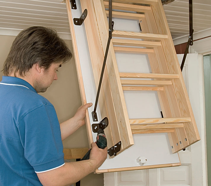 Tjek brugsanvisningen. Loftstrappen er indkøbt i det nærmeste byggemarked. Det er en type trappe, moderne huse er udstyret med, men det hindrer ikke, at vi monterer trappen i vores gamle hus. Læs monteringsvejledningen!