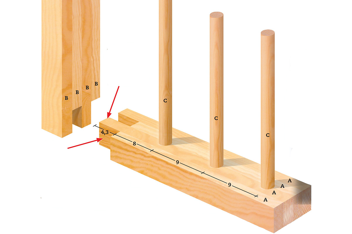 Placeringen af rundstokkene (C) føres over på den anden vandrette del af rammen med hjælp fra en tømmervinkel.