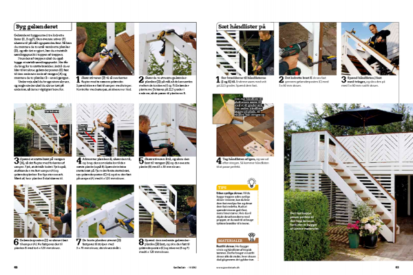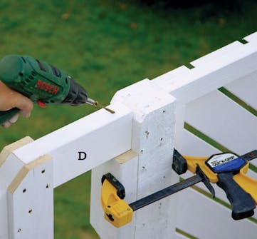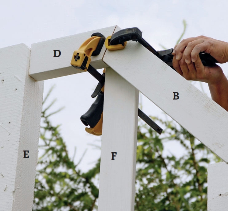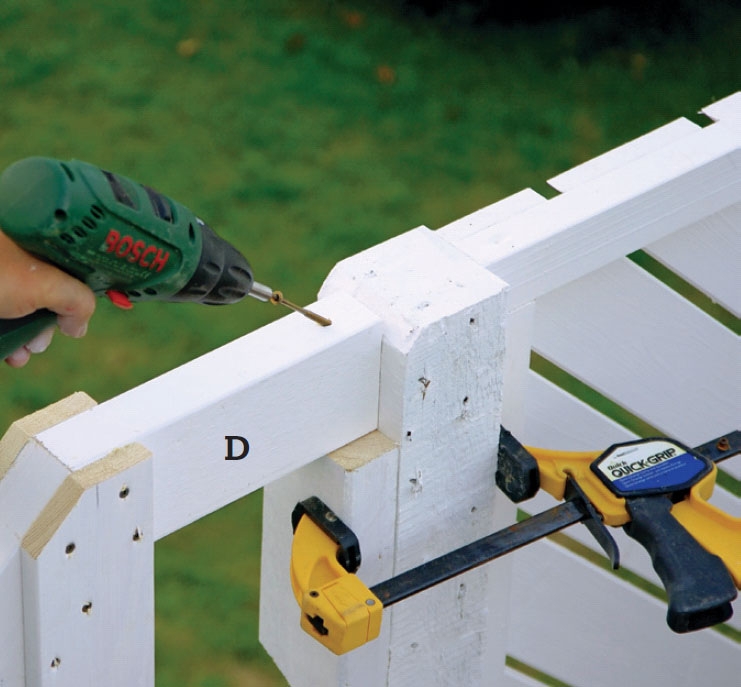 Skær de to øverste gelænder-planker (D) på mål, så de kan samles mellem de to stivere (E og F). Gelænder-plankerne D skæres på 22,5 grader i enderne, så de passer til plankerne B.