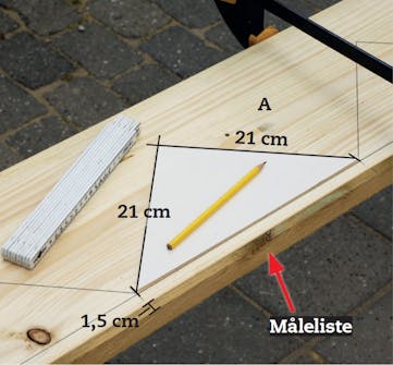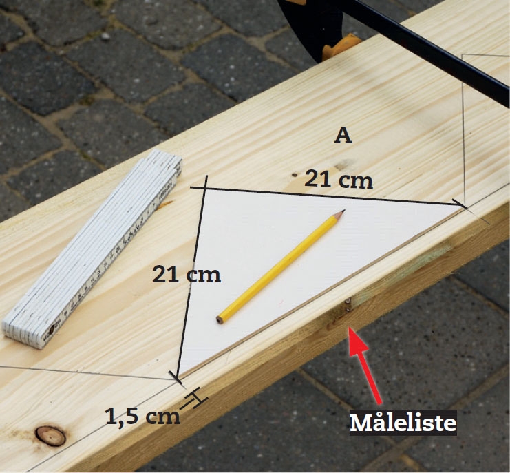Skær et retvinklet stykke pap til i en trekant. Tegn en linje 1,5 cm fra vangens (A) kant. Tegn trekanten op langs linjen. Spænd en tynd måleliste på siden af vangen til at mærke trekantens spidser af på, så opstregningen bliver ens.
