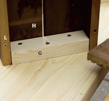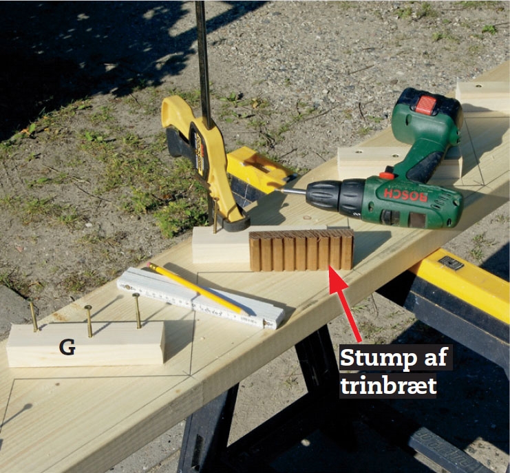 Skru bærelisterne (G) på med tre forskudt placerede 5 x 70 mm skruer. Husk at bore for. Listerne skal sidde nede under trinene, så brug en stump trinbræt til at finde den rigtige placering med.