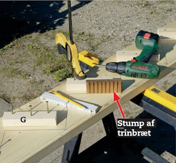 Læg to trinbrædder (H) på, og bor for til 5 mm skruer. Bor hullerne skråt, så skruerne går ind i vangen og ikke ned i bærelisterne. På den måde trækkes vangerne sammen, og du undgår at svække de lister, som bærer trinbrædderne.