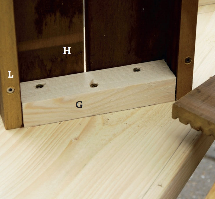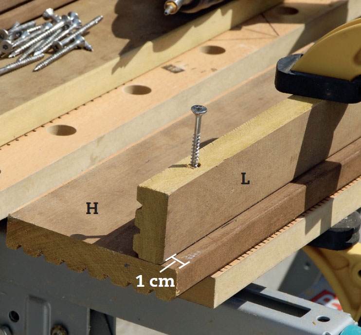 Hvert trin består af to brædder (H) med kantlister (L) under. Skru kantlisterne under trinene med fire 5 x 70 mm skruer pr. trin. Placer kantlisterne 1 cm fra trinenes kanter. Husk at bore for.