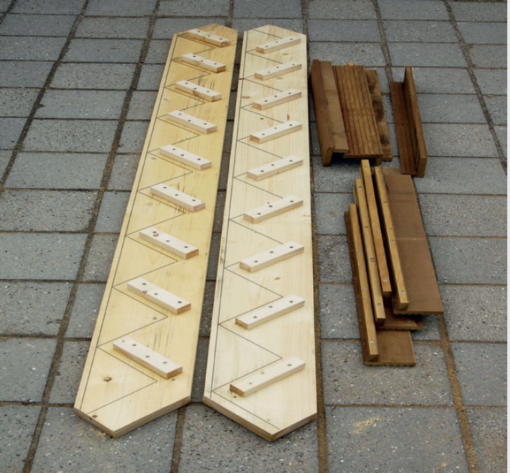 Nu er vangerne og trinene færdige - klar til at blive samlet. Men først skal vangerne grundes og males.