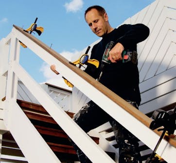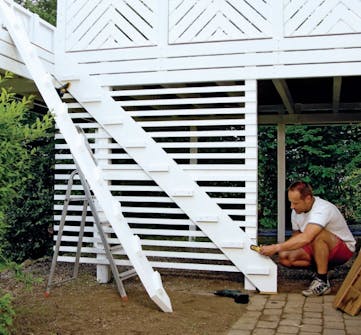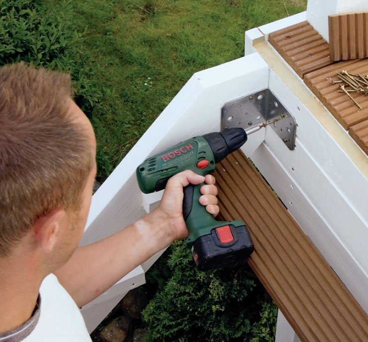 Skru indervangen fast. Her kan vi skrue den fast i siden af en høj træterrasse, så vi bruger 5 x 70 mm skruer.
