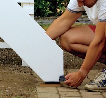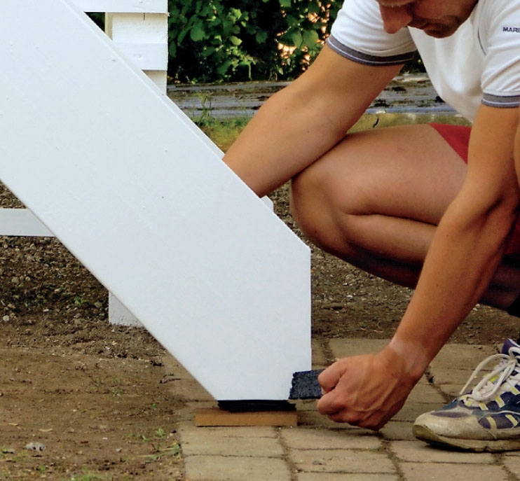 Spænd den første vange på med tvinger. Klods den lidt op på fliserne, så vangen ikke kommer til at stå i regnvand. Vi bruger et stykke terrassebræt og strimler af asfaltpap til at klodse vangen op med.