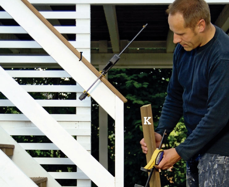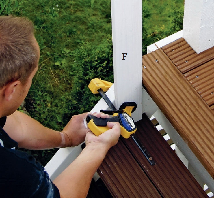 Skær stiveren (F) til, så overkanten flugter med terrassens gelænder. Spænd stiveren fast til vangen med tvinger. Kontroller med vaterpas, at stiveren er i lod.