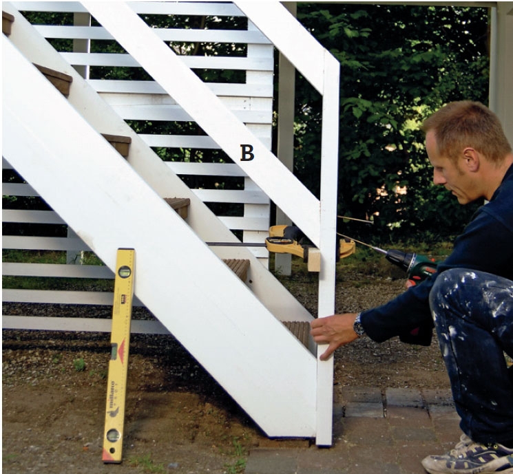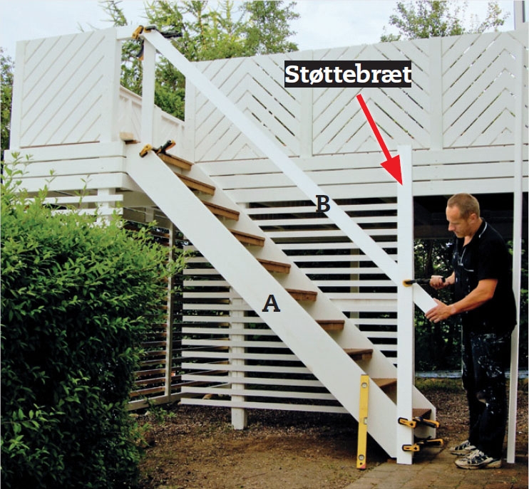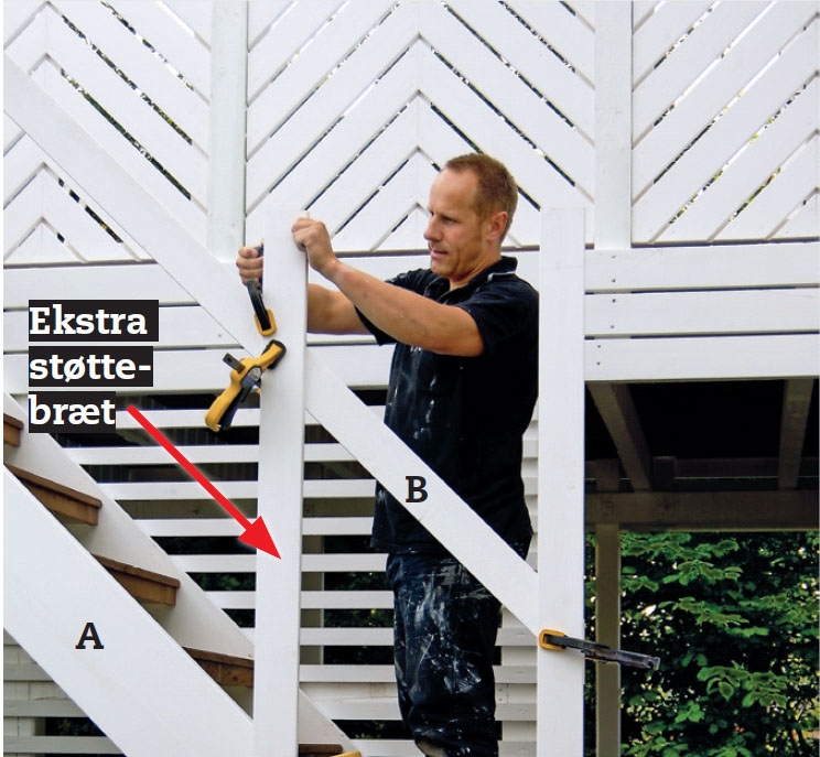 Spænd et støttebræt på vangen (A), så det flugter med forkanten af vangen. Tjek, at det står lodret. Tjek også, at afstanden mellem vangen (A) og gelænderplanken B er lige stor overalt. Mærk af, hvor planken B skal skæres til.