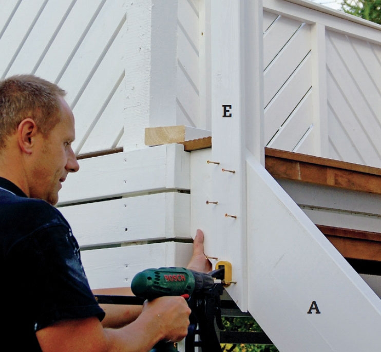 Gelænderet bygges med tre lodrette lister (C, E og F). Den øverste stiver (F) skæres til på mål og spændes fast. Så kan du montere de to små vandrette planker (D), og når det er gjort, har du et stabilt samlings punkt i toppen af trappen.