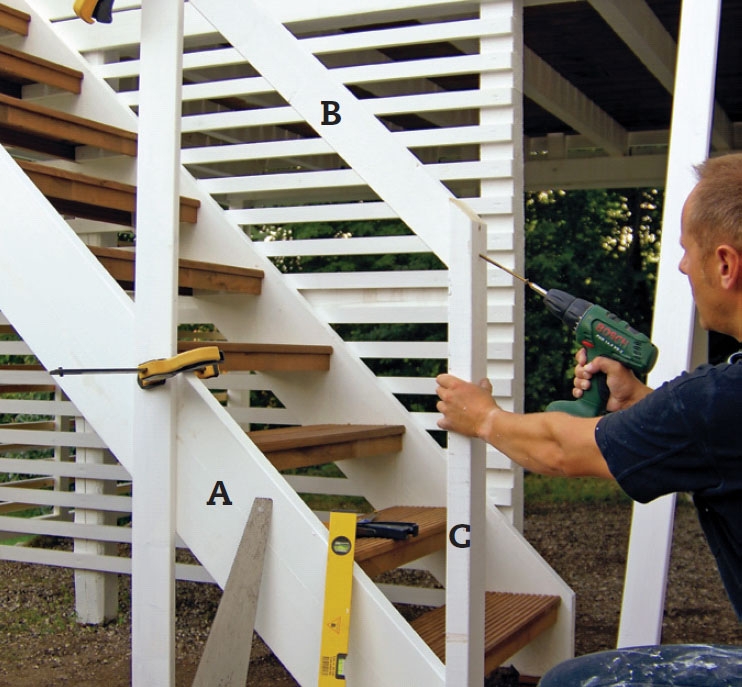 Gelænderposten (C) er skruet fast til vangen (A). Nu fastgøres den til planken B med to 6 x 120 mm skruer.
