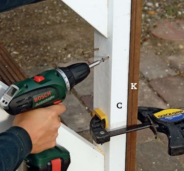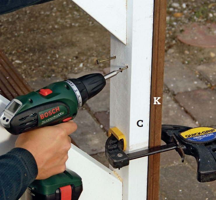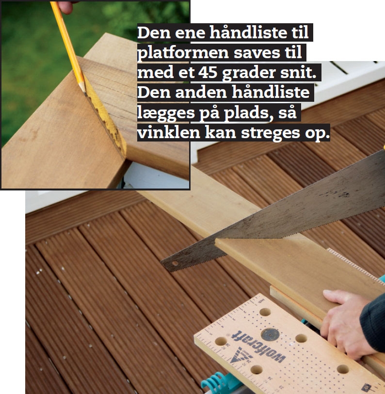 Sav brædderne til håndlisterne (J og K) til. Enderne saves med snit på 22,5 grader. Spænd dem fast.