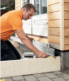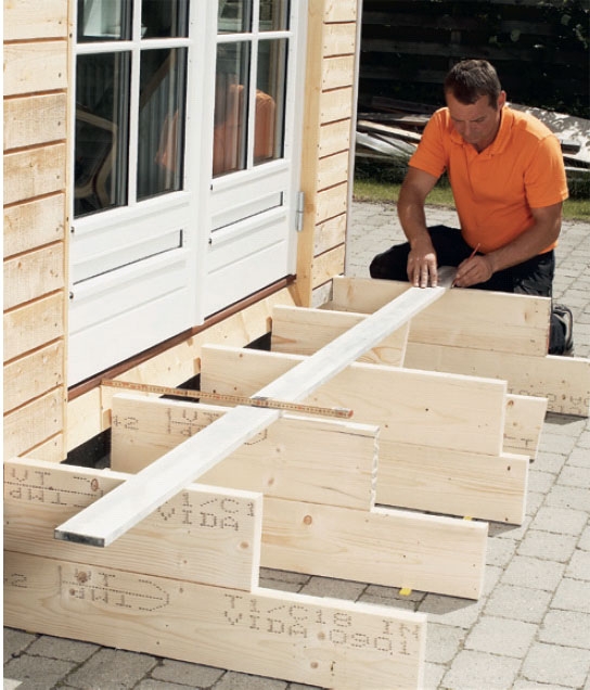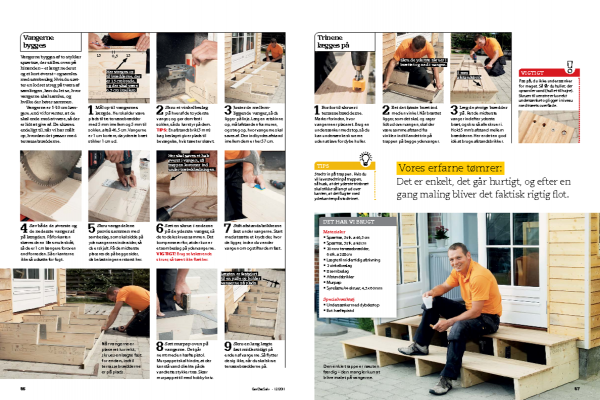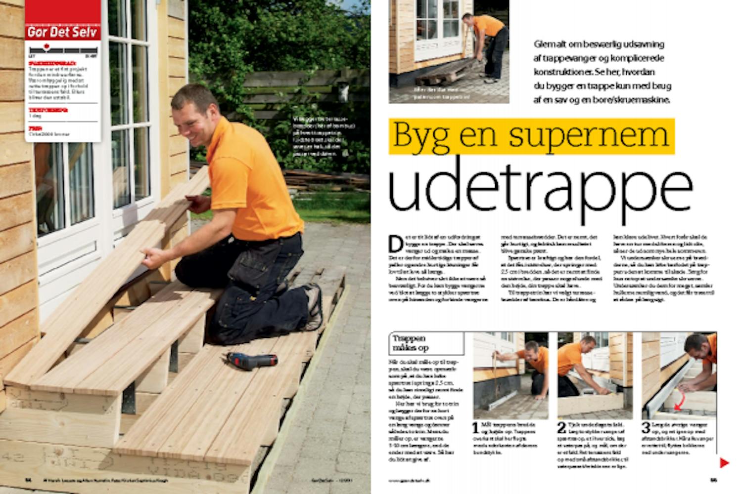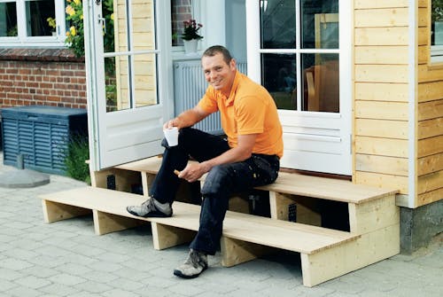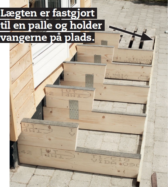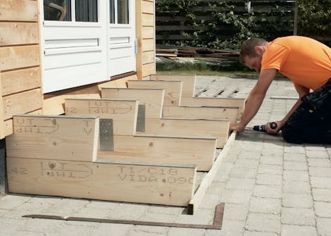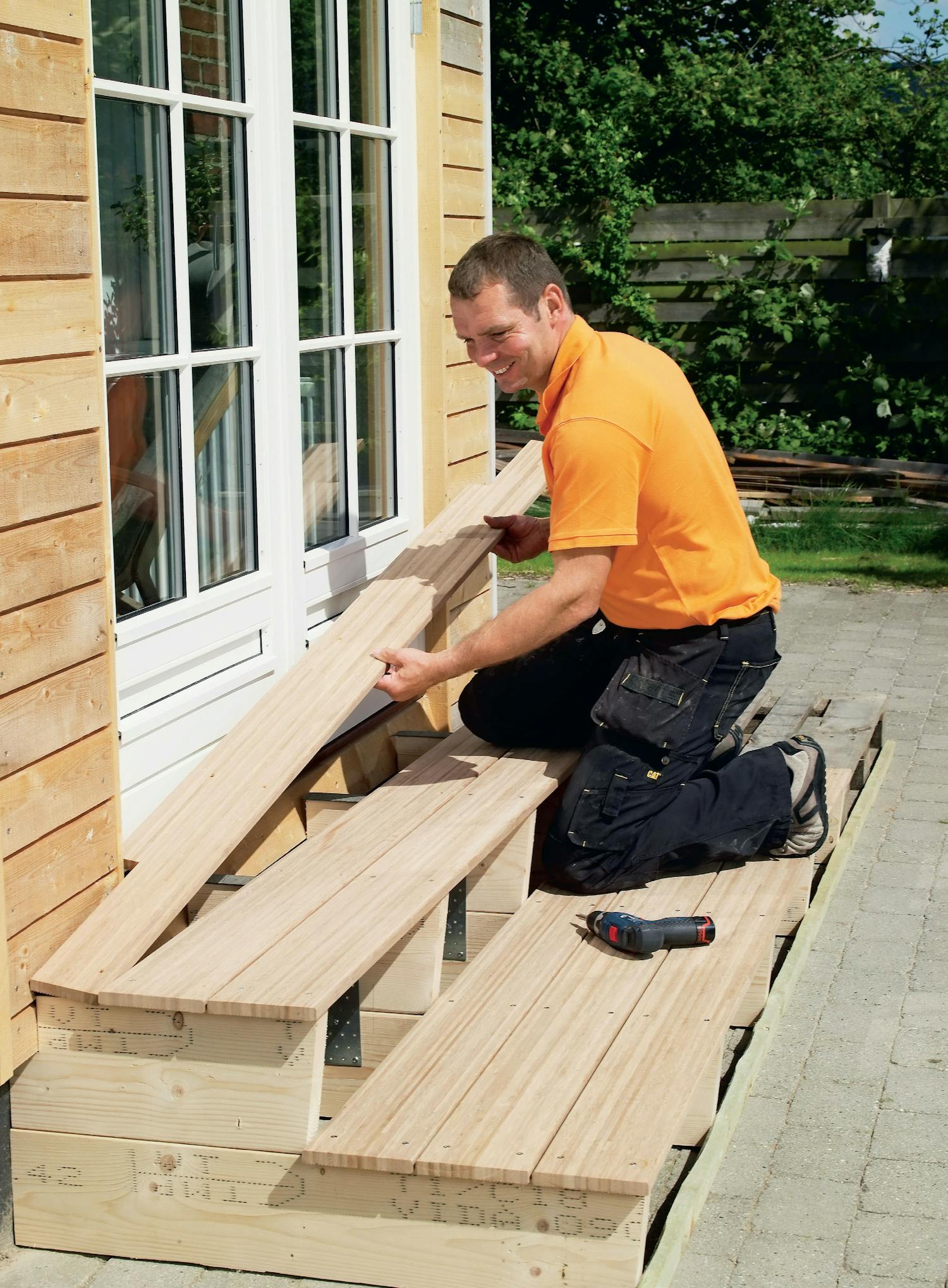 Trappen er et fint projekt for den mindre erfarne. Vær omhyggelig med at rette trappen op i forhold til terrassens fald. Ellers bliver den ustabil.