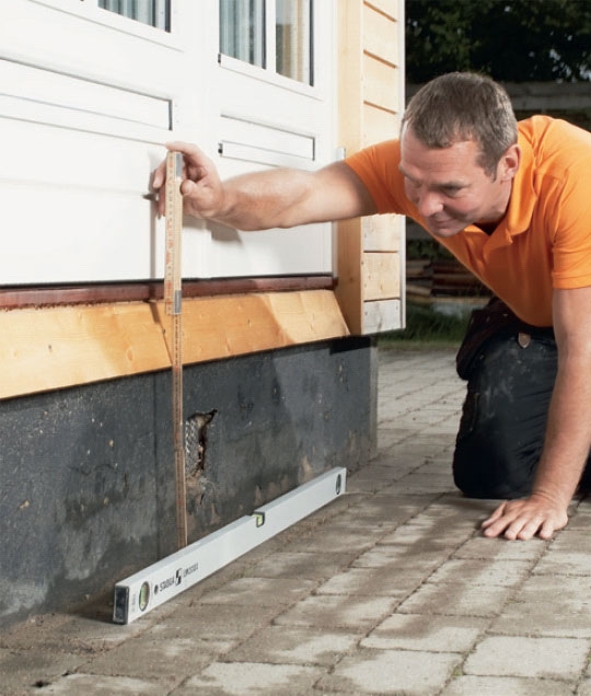 Tjek underlagets fald. Læg to stykker vanger af spærtræ op, et i hver side, læg et vaterpas på, og mål, om der er et fald. Ret terrassens fald op med små afstandsbrikker, til vaterpasset/retskinnen er lige.