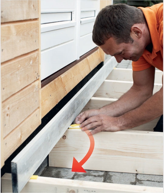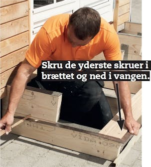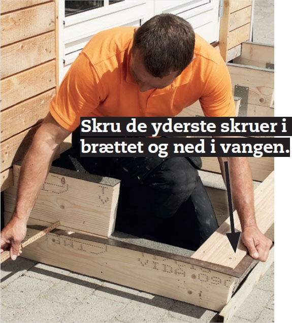 Skru en lang lægte fast midlertidigt på enden af vangerne. Så flytter de sig ikke, når du skal skrue terrassebrædderne på.