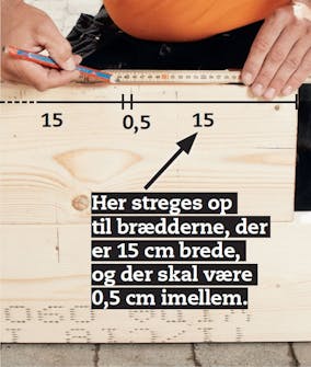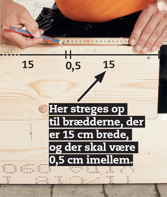Mål op til vangernes længde. Her skal der være plads til tre terrassebrædder med 5 mm imellem og 5 mm til soklen, altså 46,5 cm. Vangerne er 1 cm kortere, da yderste bræt stikker 1 cm ud.
