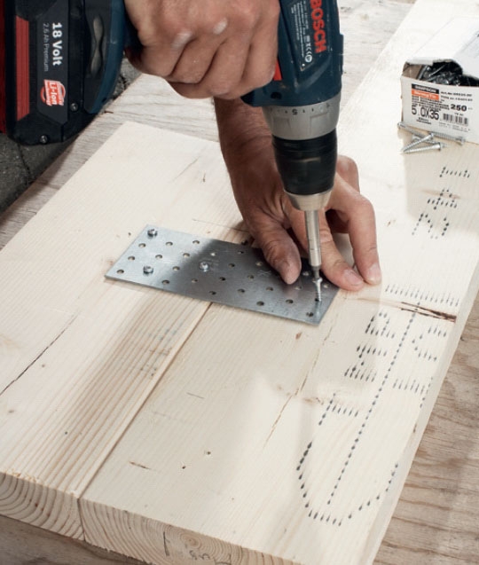 Skru vangedelene parvis sammen med sømbeslag, som skal sidde på ydervangernes indersider, så de er skjult. På de midterste placeres de på begge sider, da belastningen er størst her.