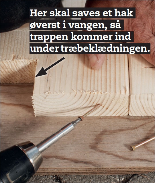 Her har vi brug for to trin og lægger derfor en kort vange af spærtræ oven på en lang vange og danner således to trin. Mens du måler op, er vangerne 5-10 cm længere, end de ender med at være. Så har du lidt at give af.