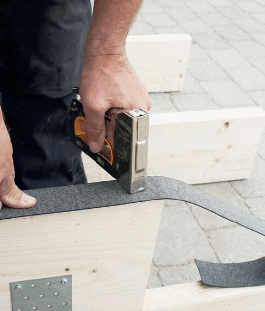 Sæt murpap oven på vangerne. Det går nemt med en hæftepistol. Murpappet skal hindre, at der kan stå vand direkte på de vandrette stykker træ. Skær murpappet til med hobbykniv.