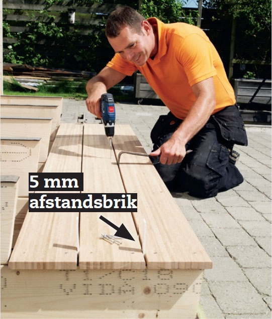 Læg de øvrige brædder på. Ret de midterste vanger ind efter yderste bræt, og skru så alle skruer i. Hold 5 mm’s afstand mellem brædderne. Her er det en god idé at bruge afstandsbrikker.