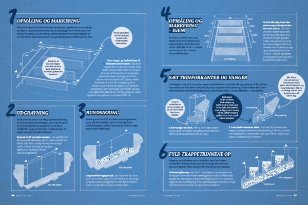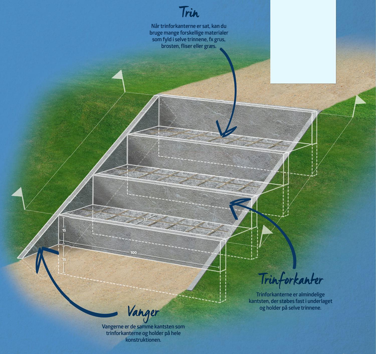 Trinnene fyldes op med 10-20 cm stabilgrus, som komprimeres forsigtigt med en hjemmelavet brolæggerjomfru (for at skåne støbningen), herefter lægges et lag afretningsgrus på 2-3 cm, og til sidst lægger du din slutbelægning. Husk, at belægningen skal have et svagt fald fremad (på 2 procent), så regnvandet kan løbe af.