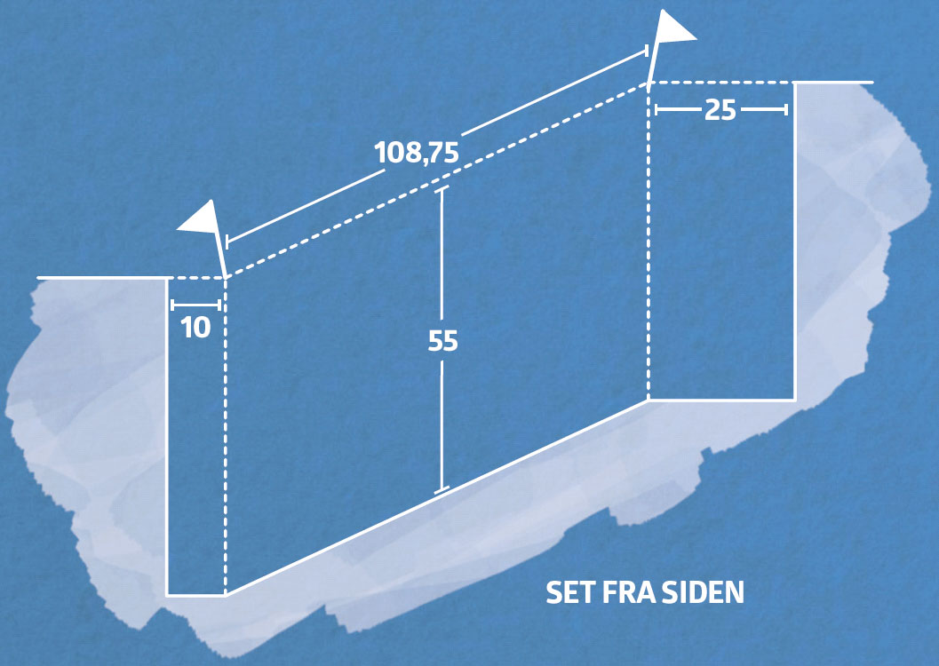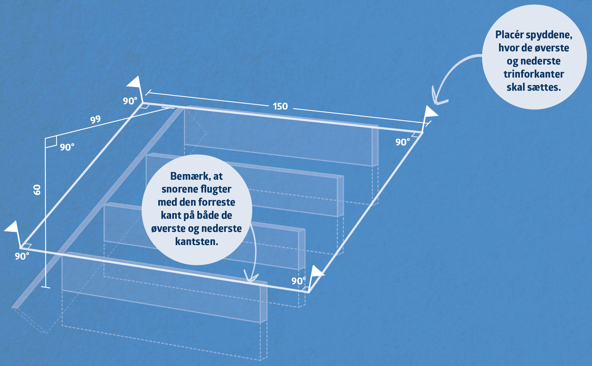 Når du har udset, hvor din havetrappe skal placeres, gælder det om at måle op og afsætte en præcis snoremarkering. Her planlægger vi 4 trinforkanter, hvilket giver 3 fodtrin af 33 cm med en samlet dybde på 99 cm og en højde på 60 cm. Derudover sikres kanten med 2 vanger bestående af 2 kantsten i hver side.