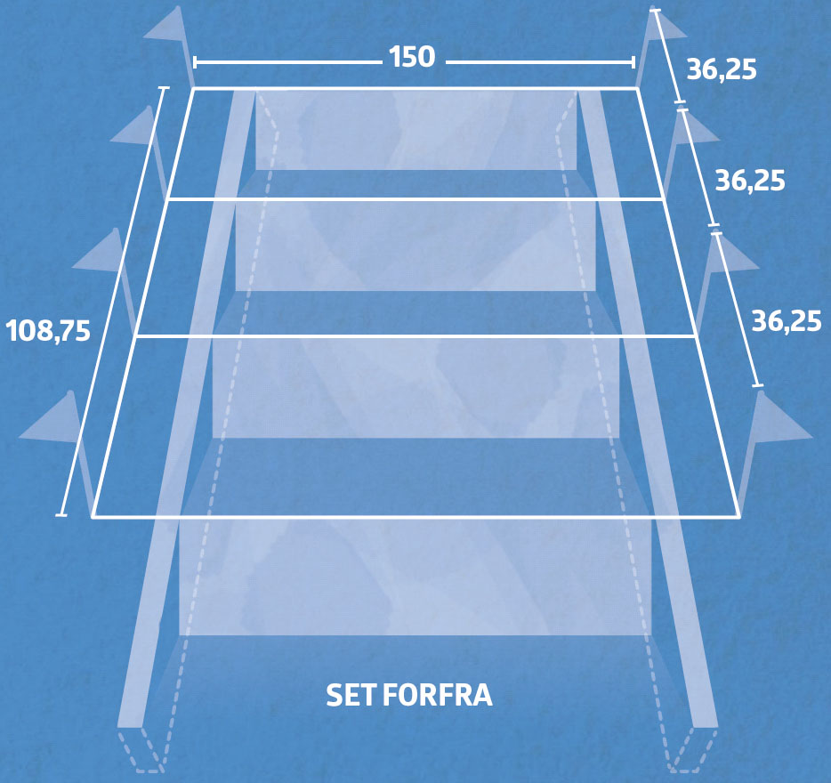Vi ved allerede, hvor den øverste og nederste trinforkant skal sættes, altså ved snorene i toppen og bunden. Derfor skal de to sidste kantsten bare fordeles parallelt mellem top og bund, hvor der her sammenlagt er 108,75 cm. Vi ender med at sætte nye spyd og markeringssnore for hver 36,25 cm. Sørg for, at snorene er i 90 graders vinkel og i vater i forhold til de første snore.
