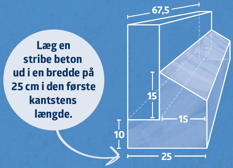 Sæt vangerne først. Mål ud, hvor lange vangerne skal være. Her bruges to kantsten i hver side, som skæres til, så de hver bliver 67,5 cm lange.