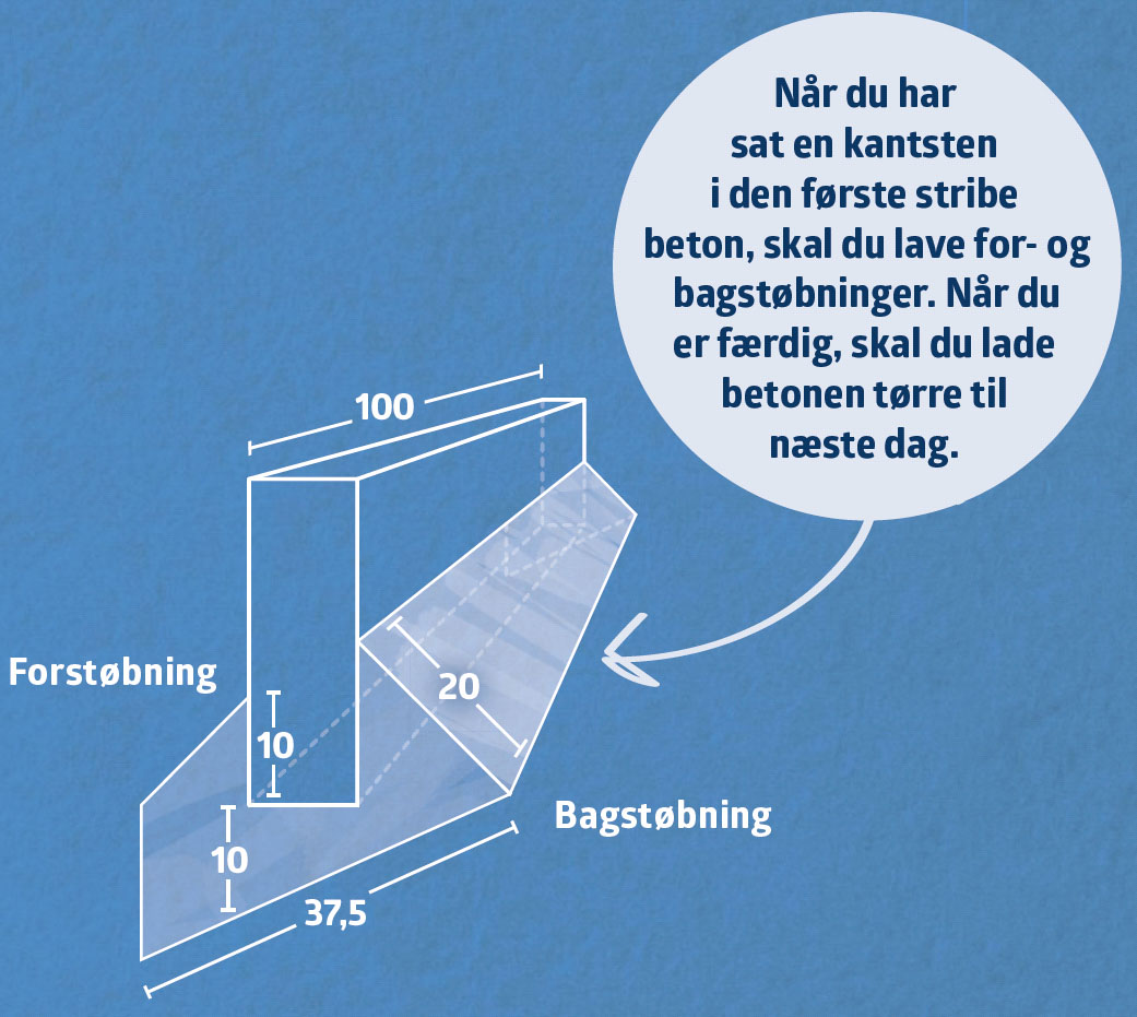 Betonlaget under stenene, både vanger og trinforkanter, skal være 10 cm tykt. Start derfor med at lægge et 12 cm lag - når du sætter stenene, synker de ca. 2 cm, og så passer pengene.