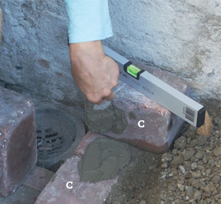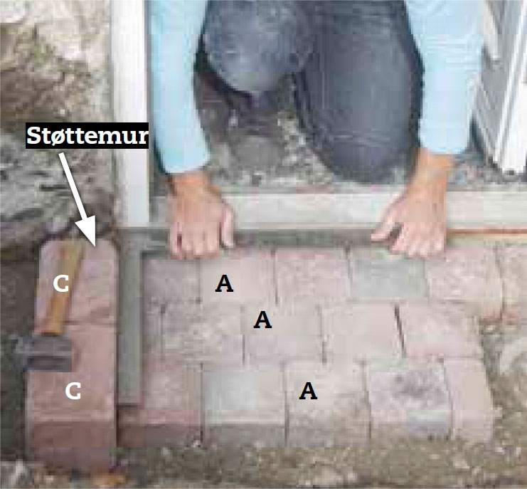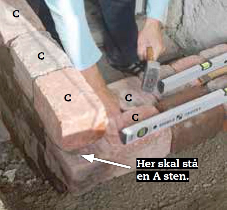 Læg de første par sten (C) til støttemuren på plads på gruset. Sørg for, at de ligger vinkelret på muren eller døren. Bank stenene godt fast i betonen med en mukkert. Kontroller, at overkanten af muren er vandret.