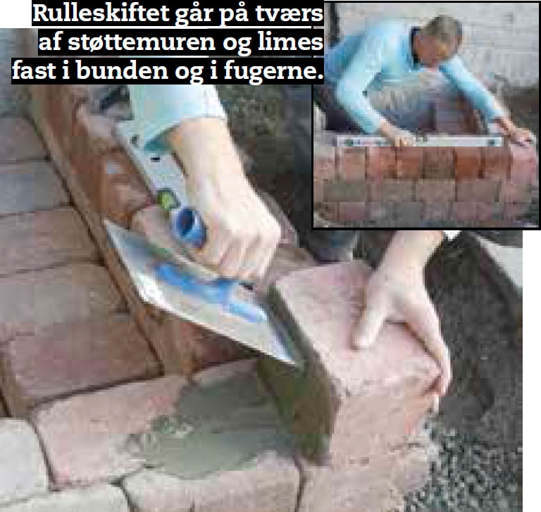 Når bunden og det første trin er klaret, går det stærkt. Muren og trinene bygges op samtidig, idet du hele tiden sørger for at fylde tørbeton under og bag trinene samt bag støttemuren. Betonen stamper du sammen med en mukkert, så den er godt pakket. Kontroller med et vaterpas, at muren holder retningen undervejs.