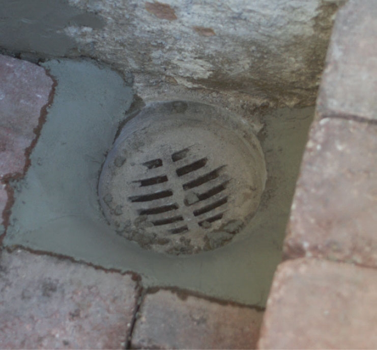 Støb med reparationsbeton, hvis der er afløb som her, så vandet ledes ned i afløbet og ikke ned under fundamentet eller ind i huset.
