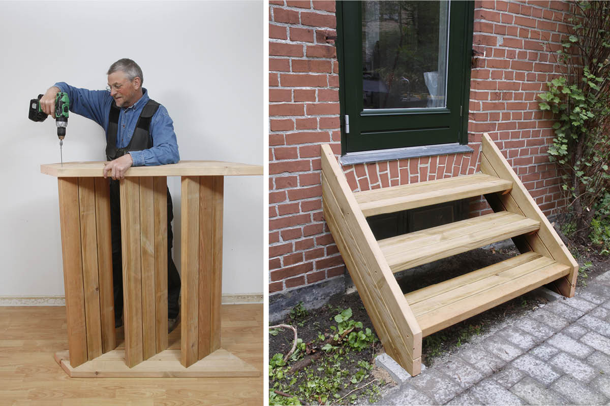 Skru trinnene fast nedefra med 5 x 80 mm skruer. Først skal du dog bore for med et 5 mm bor, ellers risikerer du, at revlerne flækker, når du skruer i dem.