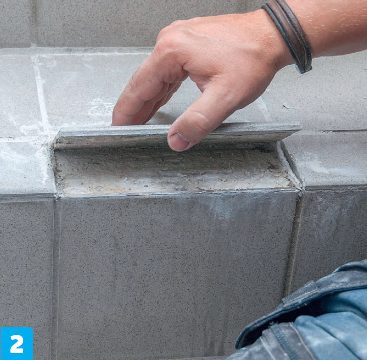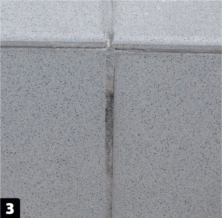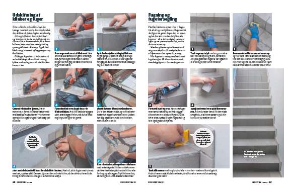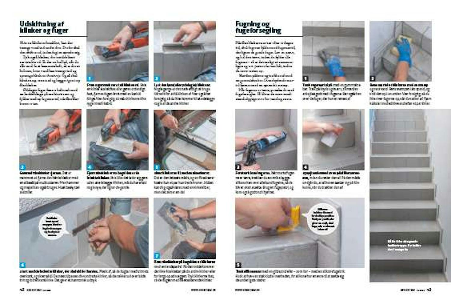 Tjek alle fuger. Misfarvede, men intakte fuger kan reddes med en let slibning. Er der derimod revner eller huller i fugen, skal den kradses eller fræses ud.