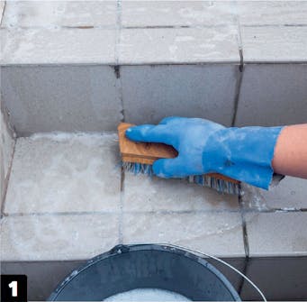 Rens alle klinker og fuger med rensemiddel. Smør alle flader, og skrub så grundigt med en stiv børste. Husk kraftige gummihandsker og beskyttelsesbriller.
