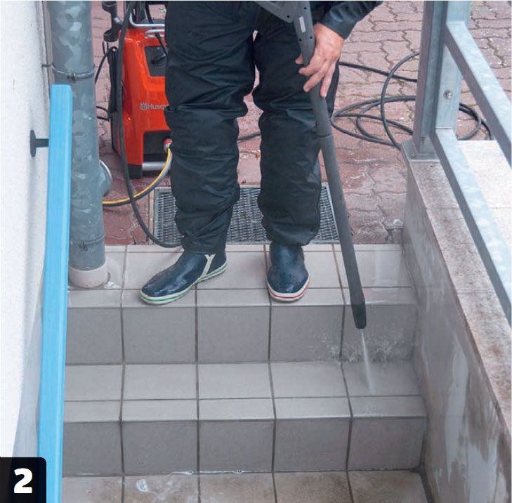 Spul overfladerne. Her bruger vi en højtryksrenser, men kost og vandslange kan også klare jobbet. Husk at tjekke, om afløbet i kælderskakten er stoppet af blade og snavs, inden du åbner for vandet.
