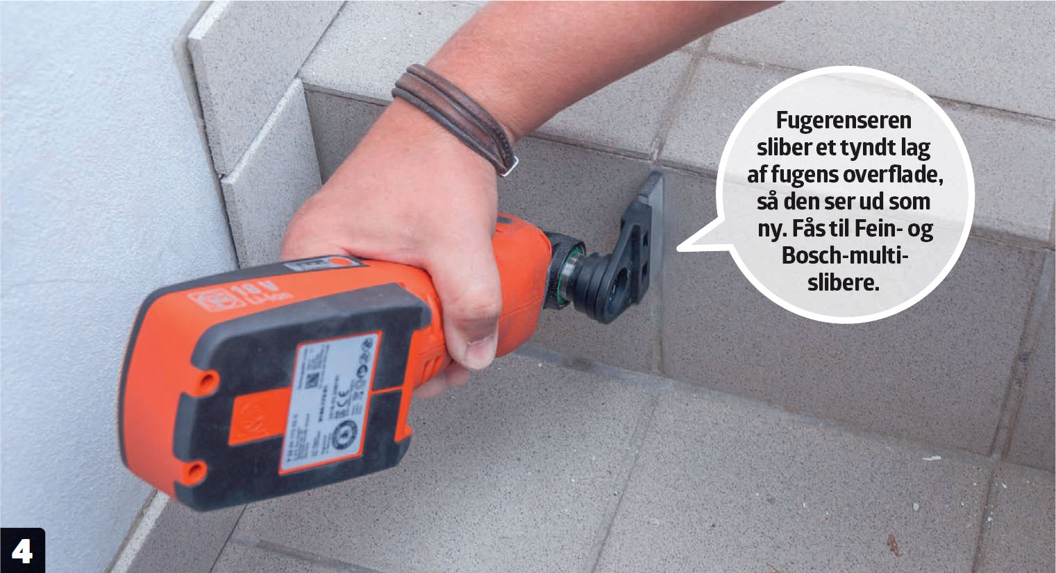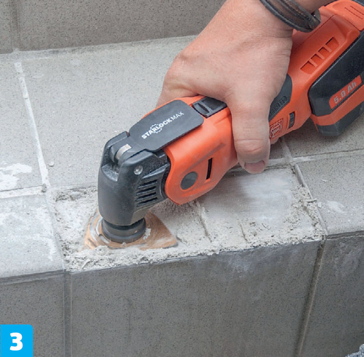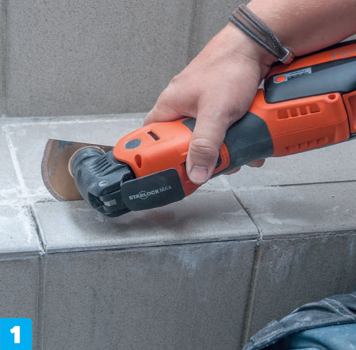 Ødelagte fuger fræses helt væk med en karbidklinge på multicutteren og fyldes med ny fugemørtel, når fliseklæberen er tør.