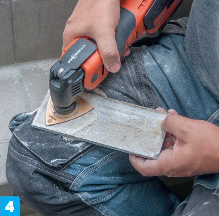 Gammel fliseklæber fjernes. Det er nemmest at fjerne den hårde klæber med en slibesål på multicutteren. Men hammer og mejsel kan også bruges. Husk beskyttelsesbriller.