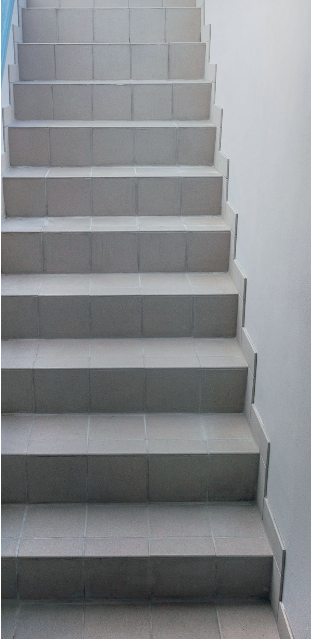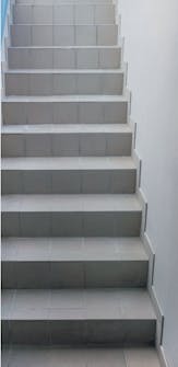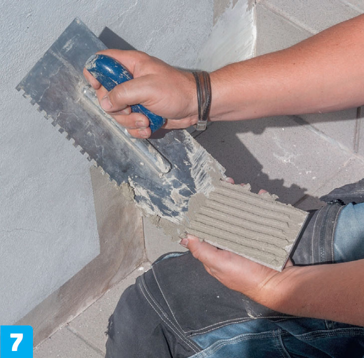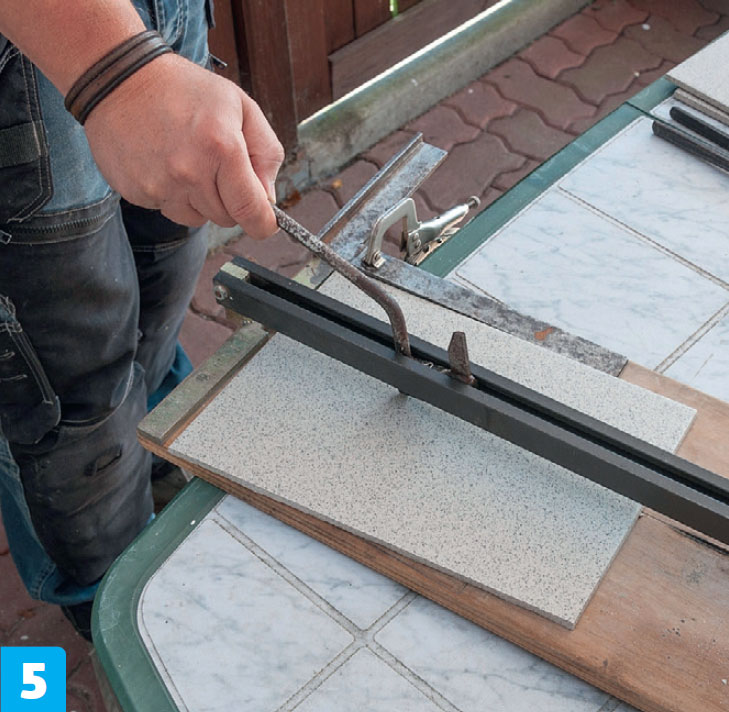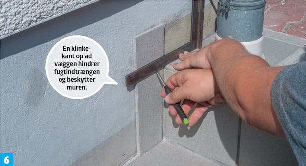 Start med de lodrette klinker, der skal sidde i kanten. Mærk af, så de flugter med trinnets overkant, og skær så til. Dernæst tilpasses de vandrette klinker, så de rækker ud over både trin og lodret kantklinke. Det giver et harmonisk udtryk.