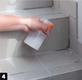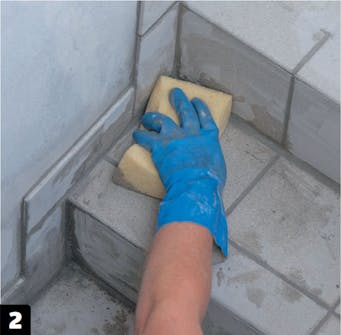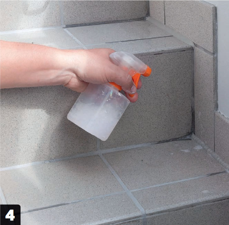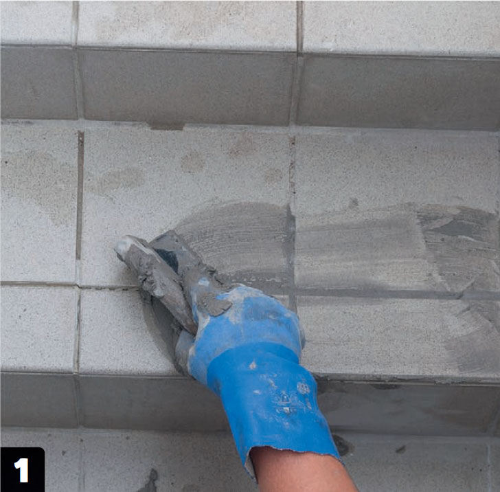 Mørtlen påføres og trækkes af med en gummiskraber. Overskydende mørtel fjernes med en opvredet svamp.