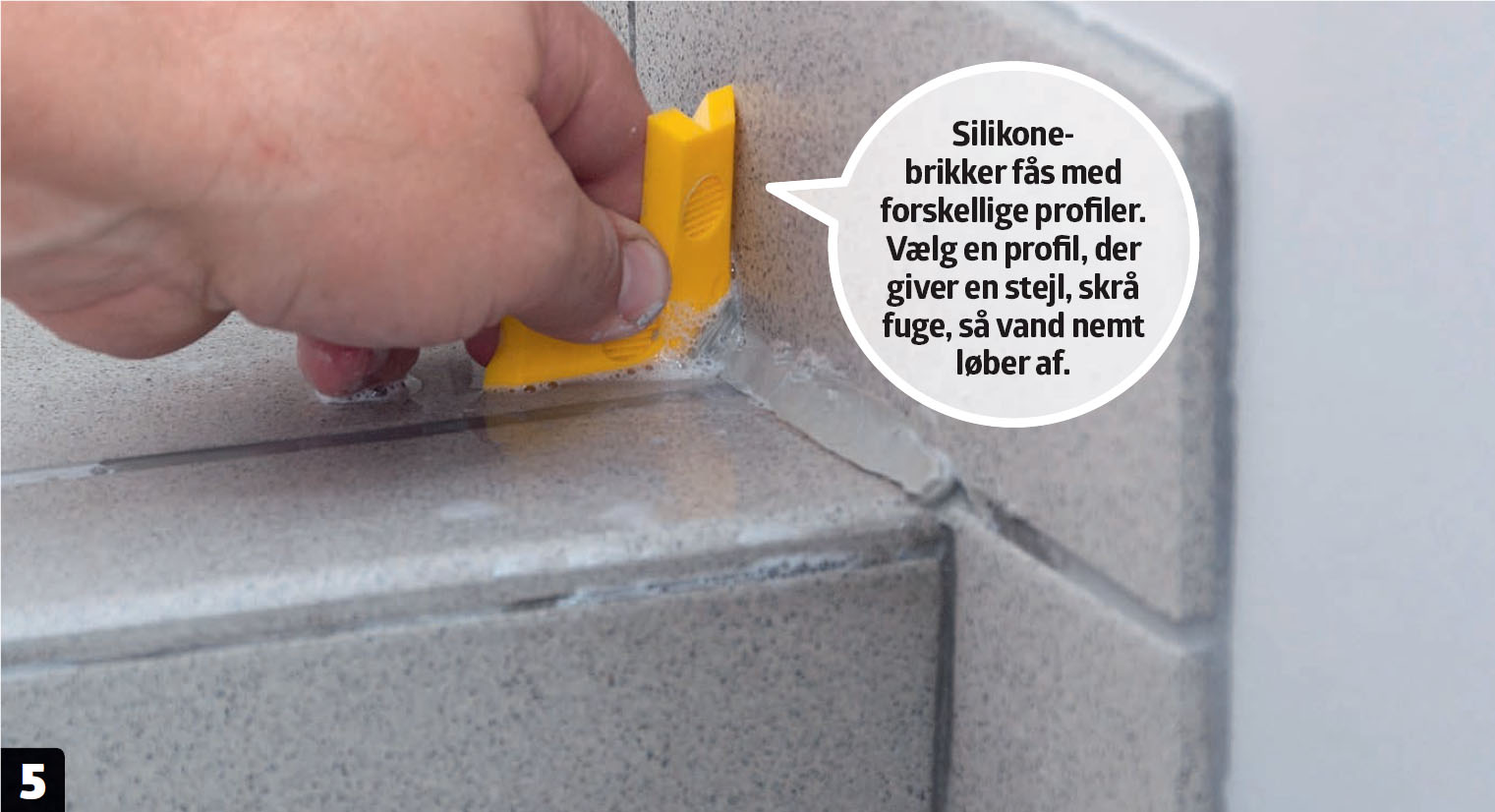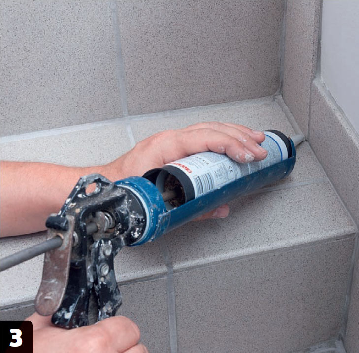 Forstærk bundfugerne. Når mørtelfugerne er tørre, trækker du en stribe byggesilikone hen over alle bundfugerne, så de bliver ekstra tætte. Brug en fugepistol, og kom også godt ind i hjørnet.