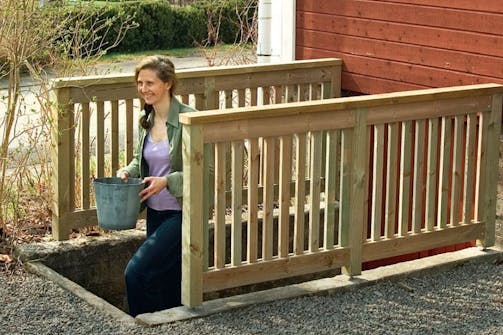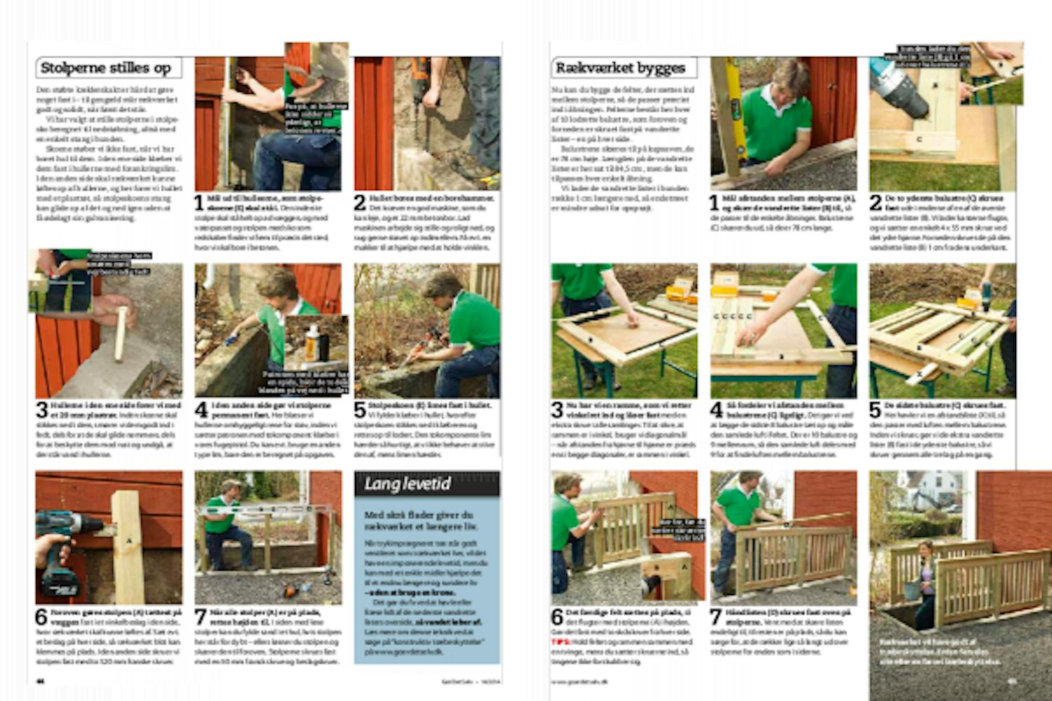 Håndlisten (D) skrues fast oven på stolperne. Vent med at skære listen endeligt til, til resten er på plads, så du kan sørge for, at de rækker lige så langt ud over stolperne for enden som i siderne.