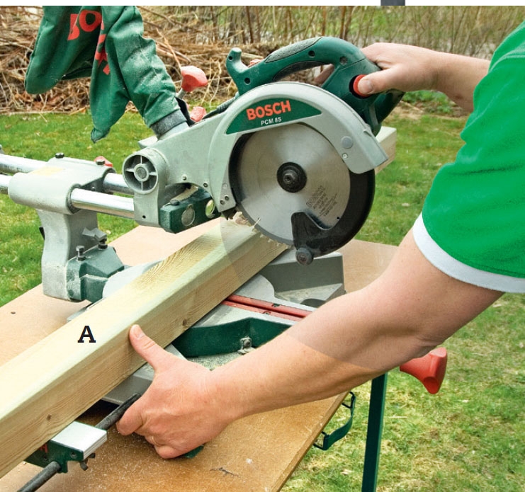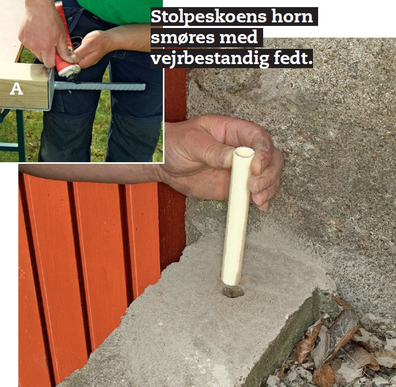Stolperne (A) skæres til i længden. I den ene ende retter vi kun stolpen af ved at fjerne skævheden, derefter korter vi den anden ende af i den rette længde. Den første ende er bedst imprægneret, og den vender vi ned mod stolpeskoen.
