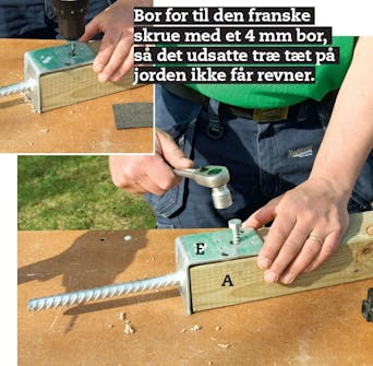 Vi skærer de seks stolper til og udstyrer dem med en stolpesko. Også her bevarer vi muligheden for at justere, når hullerne er boret, ved i første omgang kun at gøre skoen fast med en enkelt fransk skrue.