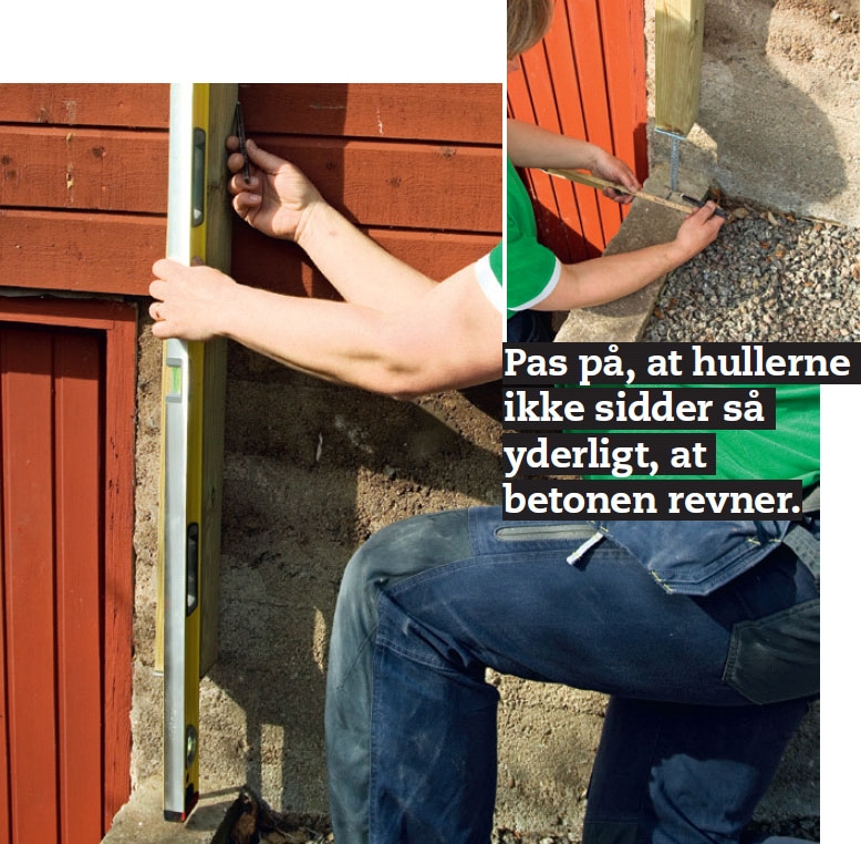 Mål ud til hulleerne, som stolpeskoene (E) skal stå i. Den inderste stolpe skal stå helt op ad væggen, og med vaterpasset og stolpen med sko som redskaber finder vi frem til præcis det sted, hvor vi skal bore i betonen.
