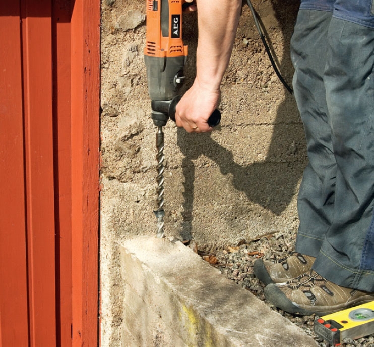 Hullet bores med en borehammer. Det kræver en god maskine, som du kan leje, og et 22 mm betonbor. Lad maskinen arbejde sig stille og roligt ned, og sug gerne støvet op indimellem. Få evt. en makker til at hjælpe med at holde vinklen.